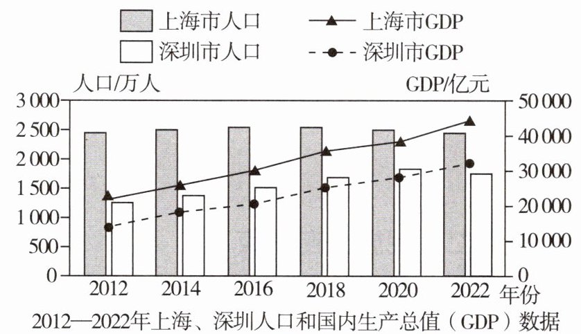 1. 关于2012—2022年上海、深圳人口和GDP的变化,表述正确的是( )