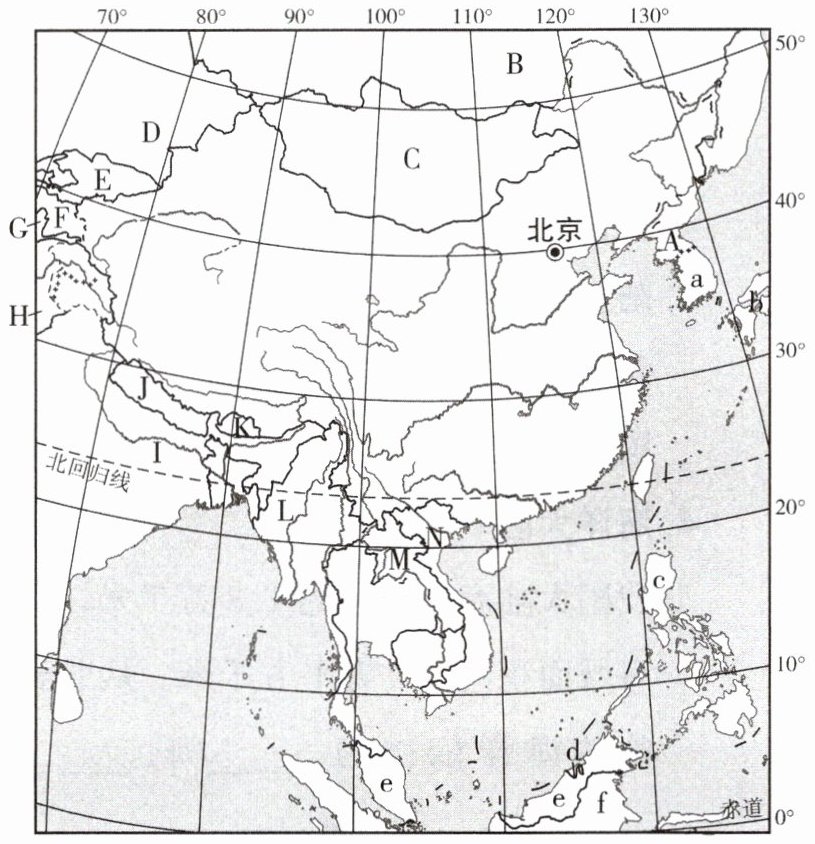 二、1.A 朝鲜 B俄罗斯 C蒙古 D哈萨克斯坦 E吉尔吉斯斯坦 F塔吉克斯坦 G阿富汗 H巴基斯坦 I印度 J尼泊尔 K不丹 L缅甸 M老挝 N越南2.a 韩国 b日本 c菲律宾 d文莱 e马来西亚 f印度尼西亚