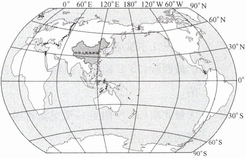 1. 在图中用彩笔描出赤道、20°W 和 160°E 的位置,并判断我国所处的半球位置。