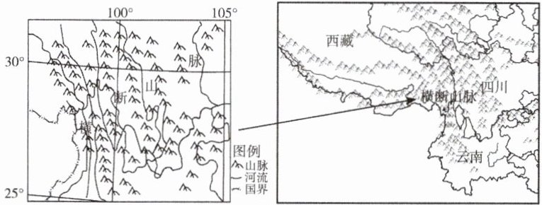 横断山区位于中国西南部,大雪山、云岭、怒山等山脉平行排列,总称横断山脉。下图为横断山脉位置示意。