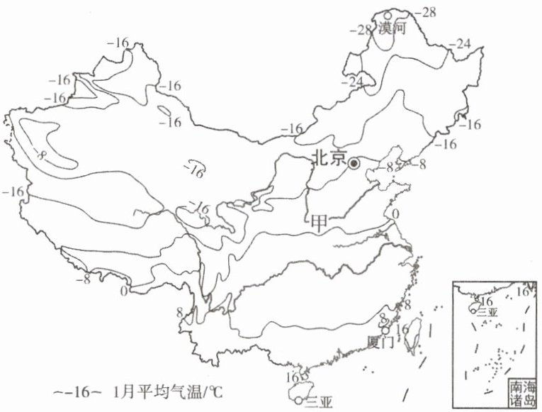 2. 比较漠河与三亚1月平均气温,会发现我国东部冬季的气温分布规律是( )