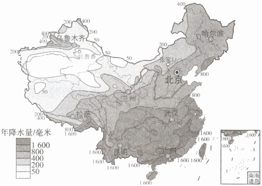 2. 读图比较广州、武汉、乌鲁木齐3个城市年降水量的大小,它们大致反映了我国降水怎样的空间分布趋势?