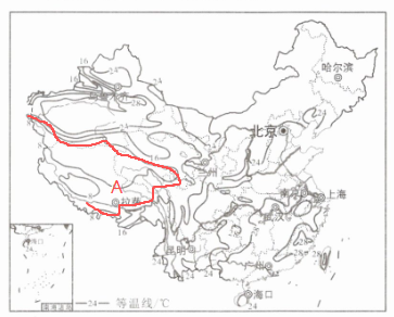 1. 在图中描出我国7月8℃等温线,并在适当位置用字母A标注青藏高原。