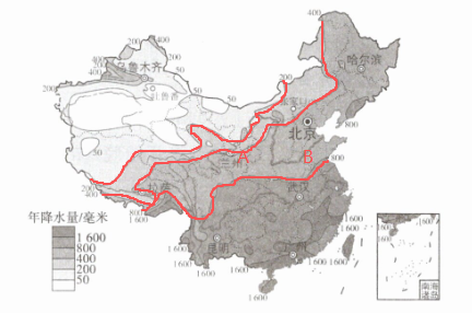 1. 在图中描出我国800毫米、400毫米、200毫米年降水量线,并在图中适当位置用字母A、B分别标注秦岭、淮河的大致位置。