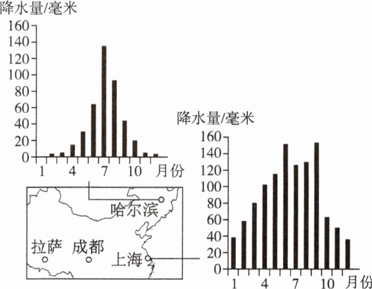 3. 上海和哈尔滨相比,1月平均气温,上海______于哈尔滨。