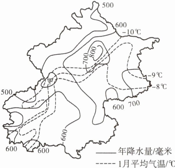 气候对区域环境影响很大。下图是我国东部某地1月平均气温和年降水量分布图。据此完成1~2题。