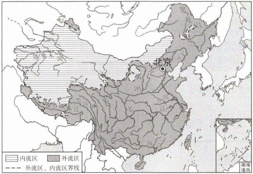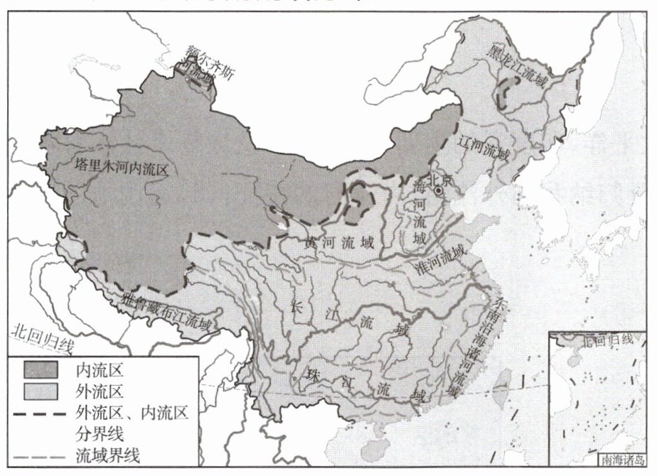 例 2 读我国内、外流区的分布示意图,完成下列问题。