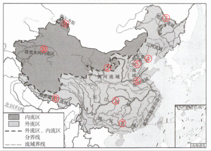 在图中适当位置标注①长江、②黄河、③黑龙江、④辽河、⑤海河、⑥淮河、⑦珠江、⑧雅鲁藏布江、⑨额尔齐斯河、⑩塔里木河的序号。