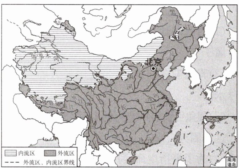 D. 内流区、外流区分界线大致与 800 毫米年降水量线吻合
