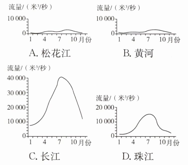 一个国家河流径流量的大小,大体可以表明这个国家水资源的多少。下图为我国四条河流的干流示意图。据此完成 5~6 题。