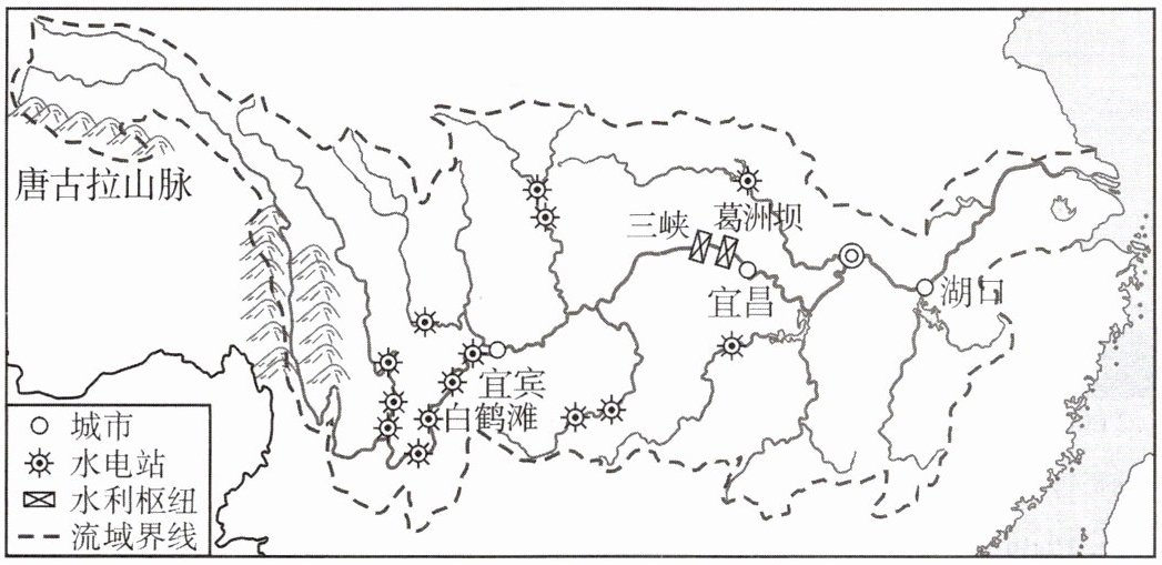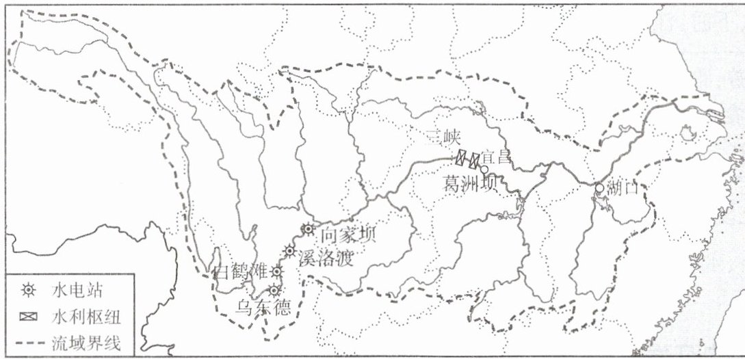 例1 位于长江上游的白鹤滩水电站,在建设中斩获6项“世界第一”,该水电站与长江其他水电站联合调度,形成世界上最大的“清洁能源走廊”。读长江流域示意图,完成下列问题。