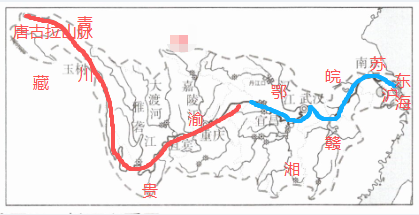 2. 在图中适当位置标注长江发源地的山脉和注入海洋的名称,以及干流流经的省区的简称。