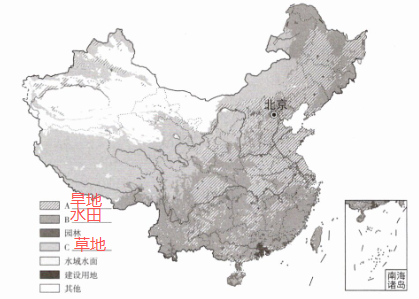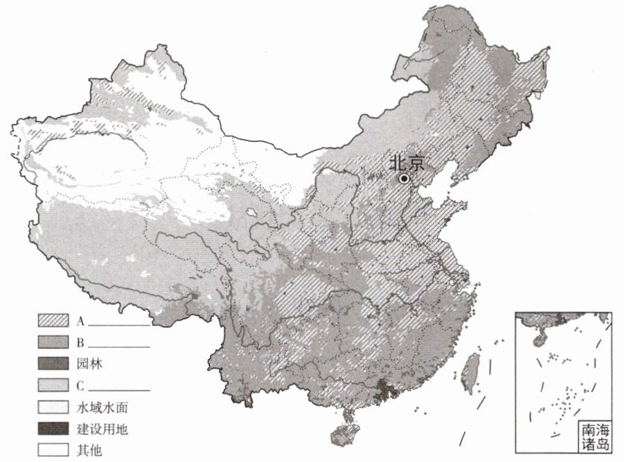 1. 在图例A、B、C处填写它们分别代表的土地利用类型。
