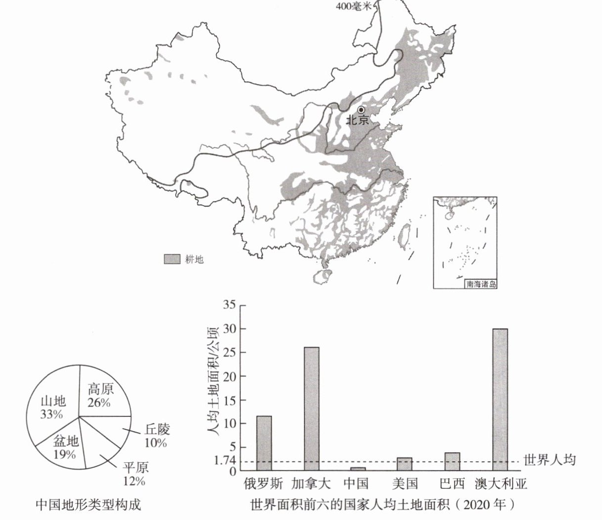 例1 农业的根基是粮食,粮食的根基是土地。我国耕地面积居世界第4位,但人均耕地面积只有世界平均水平的2/5。据此完成下列问题。