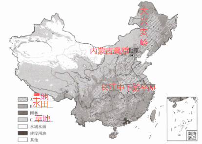 2. 在图中找出内蒙古高原、长江中下游平原、大兴安岭等地区,并在图中相应的位置标注出来,判断这些地区的主要土地利用类型及利用策略。