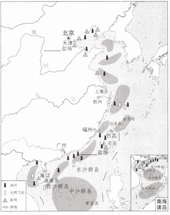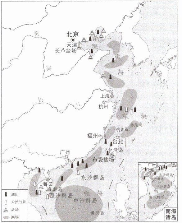 例2 我国是著名的海洋大国,辽阔的海域蕴藏着丰富的自然资源。下图示意我国海域主要资源分布。据此完成下列问题。