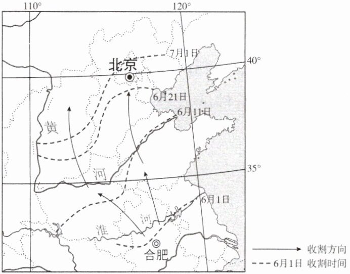 春末夏初,我国某粮食主产区的作物自南向北渐次变成金黄色。驾驶收割机的农机手们从安徽省中部出发,带着乡村收获的喜悦,一路向北,描绘祖国丰收的画卷。下图示意该主产区粮食作物收割状况。据此完成 1~2 题。