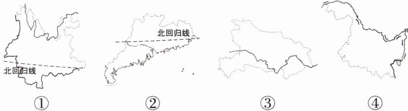 我国有 34 个省级行政区,每个省级行政区都有独特的自然和人文特点。读四个省级行政区轮廓图,完成 1~2 题。