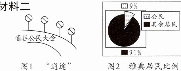 (2)材料二中,图 1 的“通途”禁止哪四类人通行?图 2 反映的雅典居民比例的情况说明了什么实质问题?