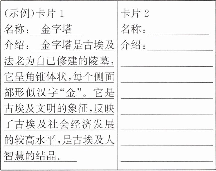 (2)第二组同学根据第一组同学搜集的图片,准备制作相关文明成果的宣传卡片,请你仿照卡片 1 的示例,帮助他们将卡片 2 中的内容补充完整。