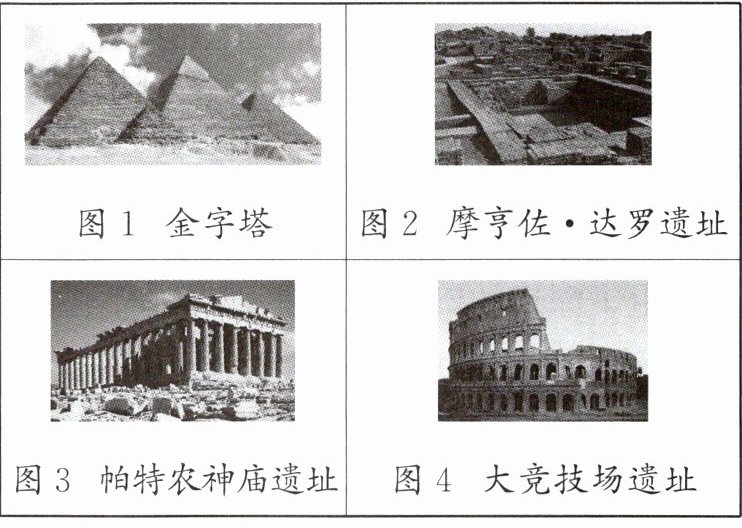 (1)大河文明:图1、图2;海洋文明:图3、图4。理由:图1是古埃及文明,图2是古印度文明,二者发源于亚非大河流域,以农业生产为主;图3是古希腊文明,图4是古罗马文明,二者发源于欧洲,工商业和海外贸易发达。