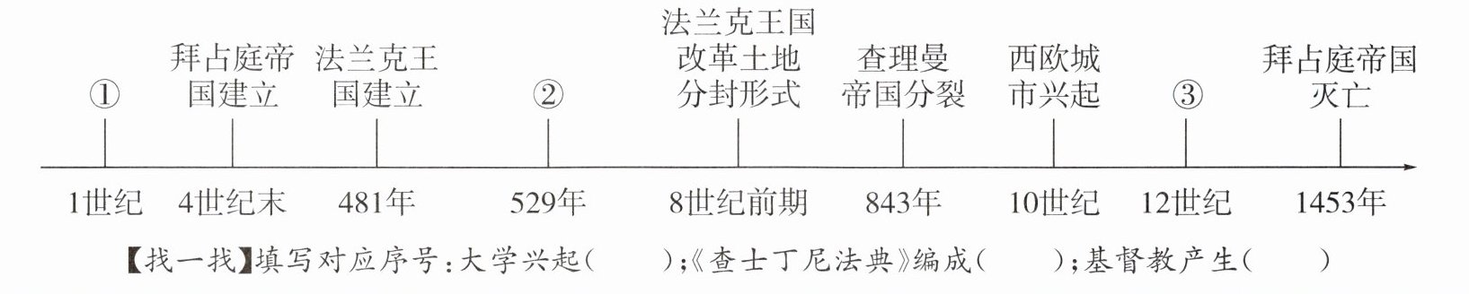 【找一找】填写对应序号:大学兴起( );《查士丁尼法典》编成( );基督教产生( )