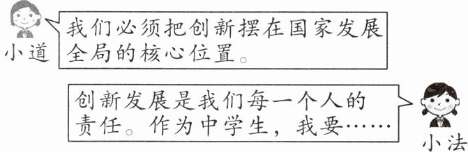 (3)小道同学的观点正确。(2分)理由:①创新是引领发展的第一动力,是一个民族进步的灵魂,是一个国家兴旺发达的不竭源泉,也是中华民族最鲜明的民族禀赋。②创新已经成为世界主要国家发展战略的重心。③在激烈的国际竞争中,唯创新者进,唯创新者强,唯创新者胜。④创新驱动是国家命运所系。因此,我们必须坚持创新发展,把创新摆在国家发展全局的核心位置。(每点2分,答出两点即可)