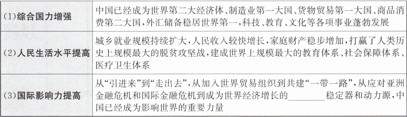 (2) 社会:①使广大人民群众参与社会劳动、创造社会财富的积极性和主动性空前高涨。②尊重劳动、尊重__________、尊重人才、尊重__________已成为社会共识。(四个“尊重”)