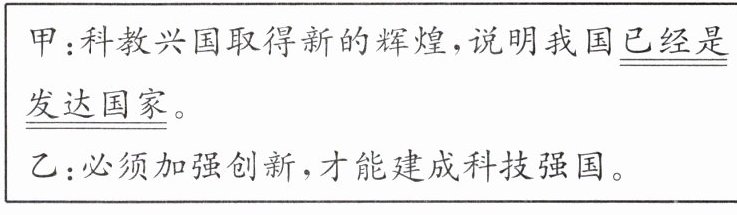 甲的观点错误。(1分)理由:①科教兴国取得新的辉煌,党的十八大以来,我国加快推进科技自立自强,基础研究和原始创新不断加强,一些关键核心技术实现突破,战略性新兴产业发展壮大,成功进入创新型国家行列。②同时,我们必须清醒认识到,我国推进高质量发展还有许多卡点瓶颈,科技创新能力还需进一步提高。这些决定了我国仍将长期处于社会主义初级阶段,是发展中国家。(每点2分) 乙的观点正确。(1分)理由:①创新是引领发展的第一动力。创新是一个民族进步的灵魂,是一个国家兴旺发达的不竭源泉,是中华民族最鲜明的民族禀赋。科技创新能力已经成为综合国力竞争的决定性因素。创新驱动是国家命运所系,创新是改革开放的生命。②建设科技强国,我们青少年要努力培养自己的创新意识和创新精神,敢于质疑,敢为人先,积极投身创新实践活动,把自己培养成为创新型人才。还需要企业努力,需要国家、社会、公民努力。只有全社会共同努力,才能建成科技强国,最终实现中华民族伟大复兴的梦想。(每点2分)