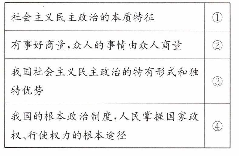 (1)①人民当家作主 ②社会主义民主的真谛 ③协商民主 ④人民代表大会制度