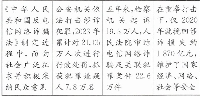【凝聚反诈合力 维护国家安全】 近年来,电信网络诈骗引起多方关注。九年级(1)班同学们为此开展了“凝聚反诈合力 维护国家安全”的探究活动。