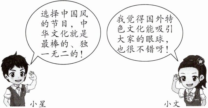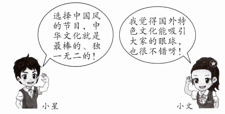 (2)①小星的观点错误,文化不分优劣,中华文化是世界优秀文化之一,中华文化独具魅力。②小文的说法正确,各民族文化共同构成姹紫嫣红、生机盎然的世界文化大花园。③面对多样的文化,我们应当用开放和包容的心态,学习和借鉴优秀外来文化,以我为主,为我所用。