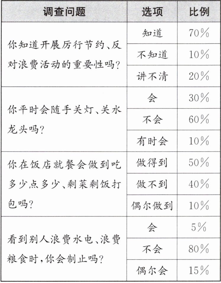 3. 主题探究活动 习近平总书记强调,要进一步加强宣传教育,切实培养节约习惯,在全社会营造浪费可耻、节约光荣的氛围。某校九年级(1)班学生围绕“厉行节约、反对浪费”的主题开展了相关实践探究活动,请你参与其中并完成相关任务。