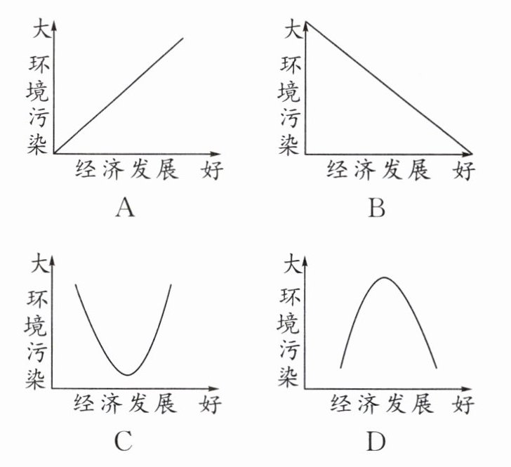 2. 跨学科·数学 经济学家发现,随着国家经济发展,环境污染由低趋高,但随着经济进一步发展,环境污染的程度却又逐渐减缓,环境质量反而会逐渐得到改善。依据上述理论,下列图表对“经济增长”和“环境保护”之间的关系,表示正确的是( )