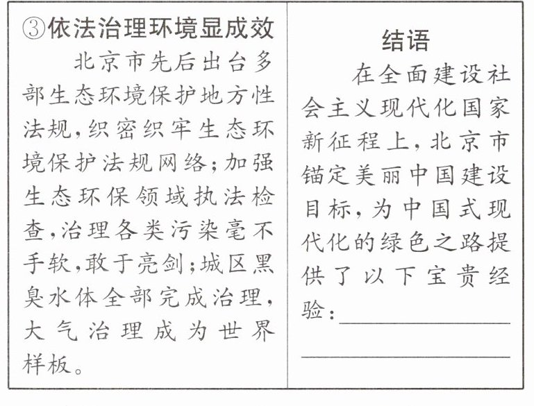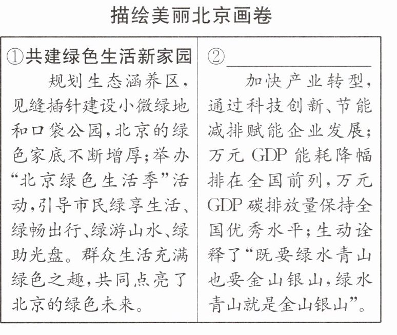 3. 设计板报 绿水青山为笔,描绘美丽北京画卷。十年来,我国生态环境发生历史性、转折性、全局性变化,美丽中国建设迈出重大步伐。为了展示家乡发展成就,探寻绿色发展的北京经验,某班同学以“描绘美丽中国的北京画卷”为主题,设计了一期板报,请协助他们完成相关内容。