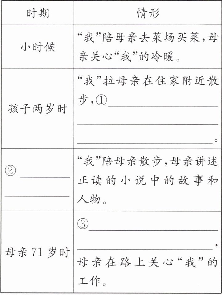 12. 仿照示例,梳理“我”陪母亲散步时难忘的情形,填写下表。