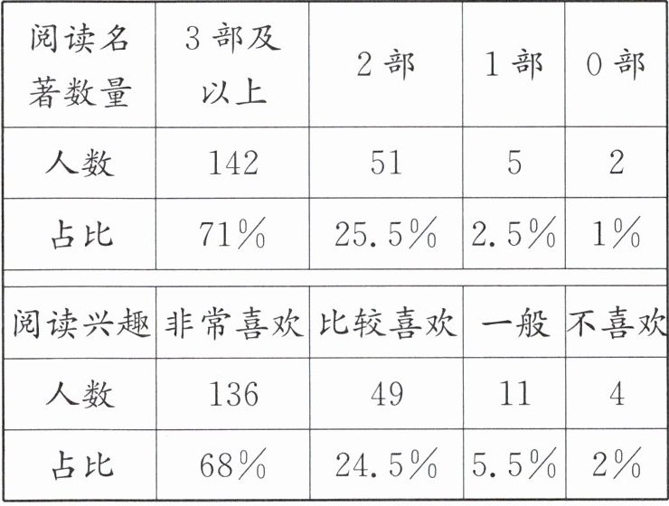 材料三:各地中小学广泛开展争创“书香校园”活动,阅读名著在中小学学生中已蔚然成风。2023 年“世界读书日”前夕,某中学语文组就本校各年级学生在本学年阅读名著的情况进行了问卷调查。七年级参加调查的学生共 200 人,调查结果如下: