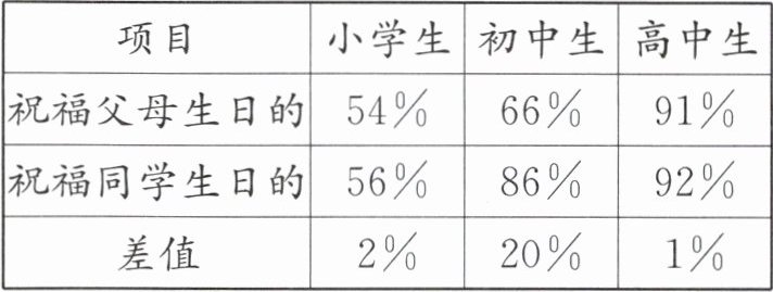 (2)示例:随着年龄的增长,关注父母生日和关注同学生日的学生越来越多,但初中生对父母生日的关注度远远低于对同学生日的关注度。