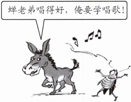 (2)①图上画了一头驴和一只蝉,蝉正在唱歌,驴听了,心想:蝉老弟唱得好,俺要学唱歌!(只能客观介绍,不能展开想象进行描写或议论) ②不能盲目模仿,要根据自己的特点走适合自己的路。(言之有理即可)