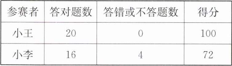 4. [2024 长沙模拟]12 月 4 日为全国法制宣传日,学校组织 4 名学生参加法制知识竞赛,共设 20 道选择题,各题分值相同,答错或不答均扣分. 如表记录了其中 2 名参赛学生的得分情况.