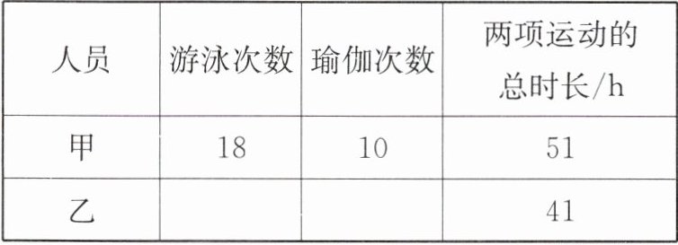5. [2024 西城模拟]随着民众健康意识逐步增强,全民健身逐渐成为“健康中国”新时尚. 下表是甲、乙两人某月参与游泳和瑜伽项目的运动次数及时间的统计表,其中同一健身项目每人每次运动的时间相同,且甲、乙两人每次游泳的时间为 2 h.