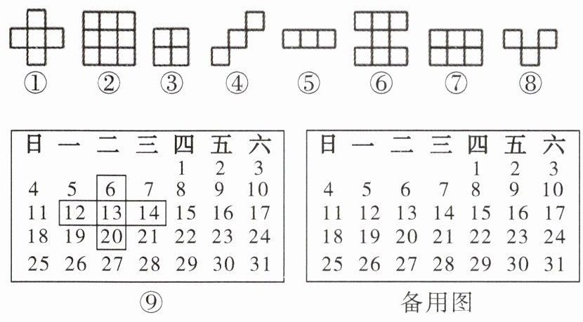 [2023 东莞模拟]如图所示的 8 个图形,都是由相同的小正方形拼成的对称图形,分别将这 8 个图形放在某月历图片上,使每个图形的每个小正方形各圈住一个日期,如果某图形圈住的日期数之和是这个图形的小正方形个数的整数倍数,那么这个图形叫作“倍数图形”。