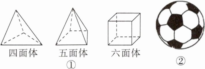 (3) 足球一般由32块黑白皮子缝合而成(如图②),且黑色的是正五边形,白色的是正六边形,如果我们可以近似把足球看成一个多面体. 你能利用欧拉公式计算出正五边形和正六边形各有多少块吗?请写出你的解答过程.