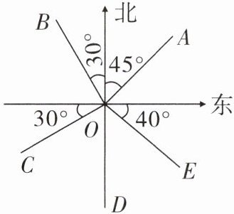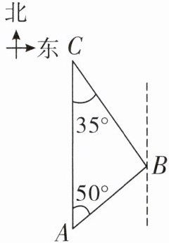 7. 如图,点$C$位于点$A$正北方向,点$B$位于点$A$北偏东$50^{\circ}$方向,点$B$位于点$C$南偏东$35^{\circ}$方向,则$∠ABC$的度数为______。