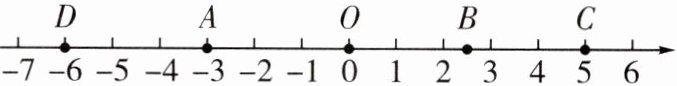 11. 如图,数轴上的点 $A$,$O$,$B$,$C$,$D$ 分别表示 $-3$,$0$,$2.5$,$5$,$-6$。