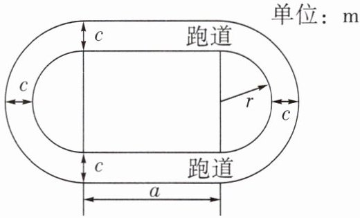 (1) 用含 $a$,$r$ 的代数式表示跑道内侧的周长为______ $m$,用含 $a$,$r$,$c$ 的代数式表示跑道外侧的周长为______ $m$。