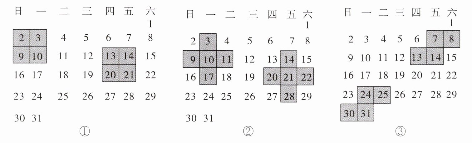 图①是某年10月的月历,如阴影部分所示,任意“田”字型框中的4个数均满足“对角线上的两个数之和相等”。理由如下: