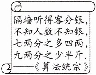 9. [新趋势·数学文化]明代数学家程大位的《算法统宗》中有这样一个问题(如图),其大意为:有一群人分银子,若每人分七两,则剩余四两;若每人分九两,则还差八两. 所分的银子共有______两(注:明代时,1斤=16两,故有“半斤八两”这个成语).