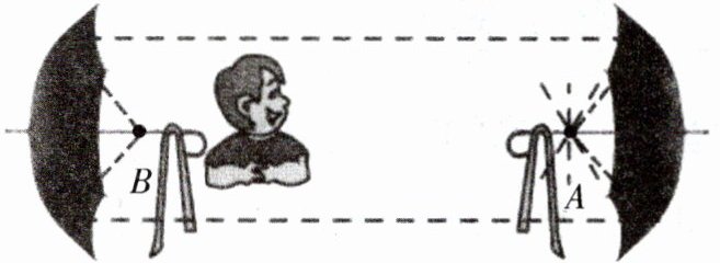 8. 如图所示,学习了声现象之后,爱思考的小王在右边伞柄的A点挂一块机械手表可发出滴答滴答的声音,当他的耳朵位于B点时听不到声音,把另一把伞放在左边图示位置后在B点听到了手表的滴答声,伞增大了人听到声音的______(选填“音调”“响度”或“音色”),减少了声音的分散,生活中的______(选填“听诊器”或“声呐”)就利用了这一原理。