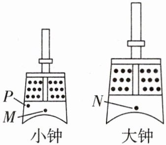 5. 编钟是我国瑰宝,如图所示,敲M处发出的声音音调比敲N处的高,比敲P处的低,则( )